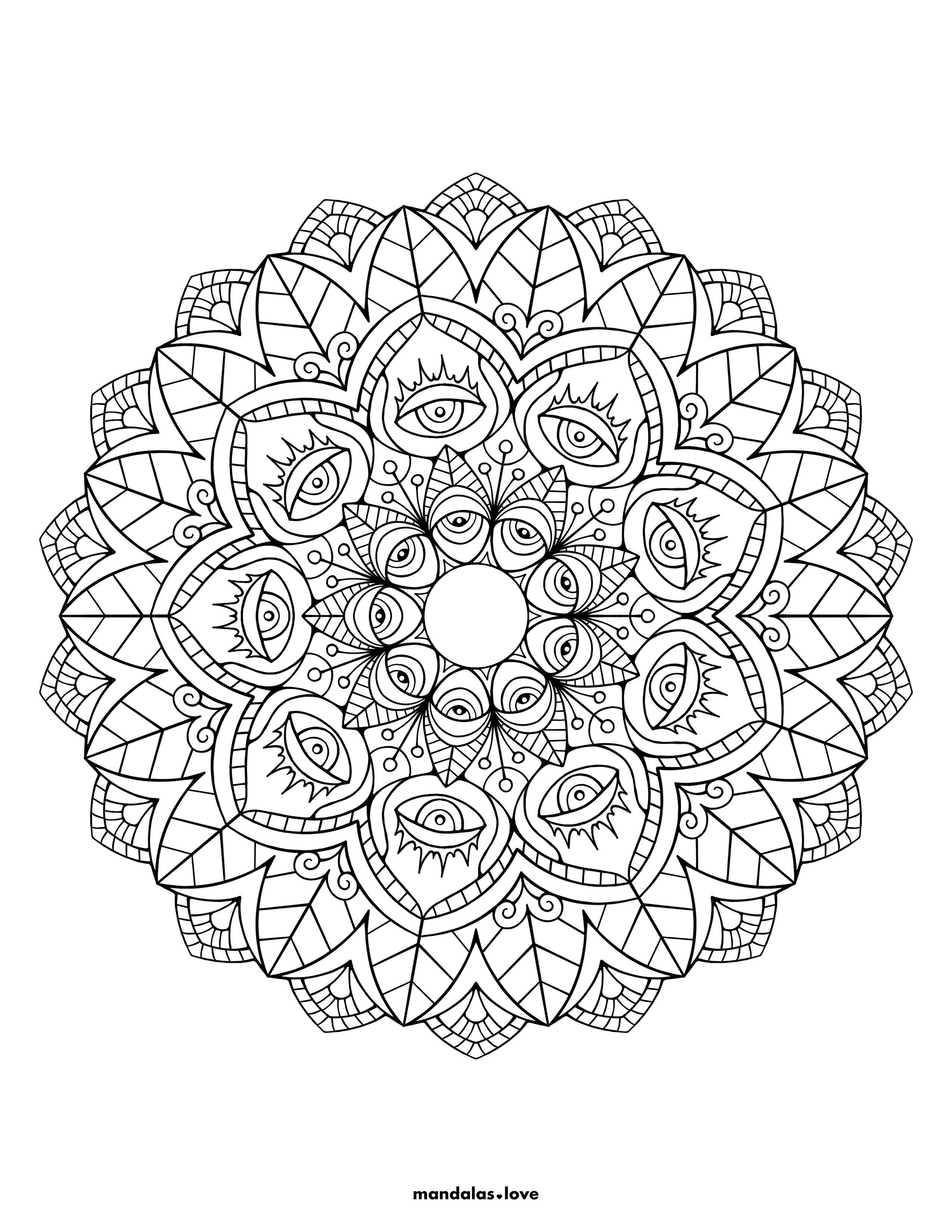 Advanced 9-Sided Mandala Coloring Page with Funky Eyes and Fire