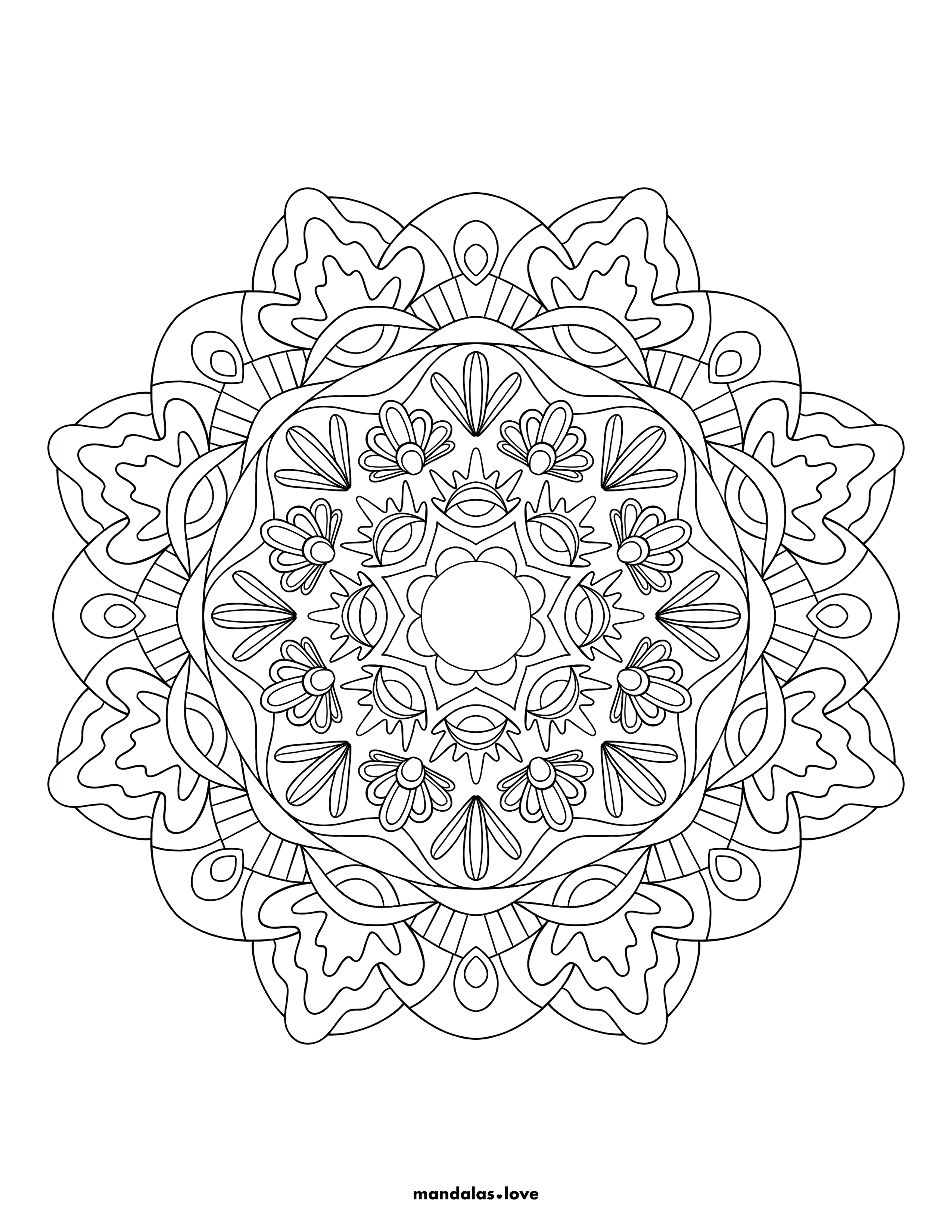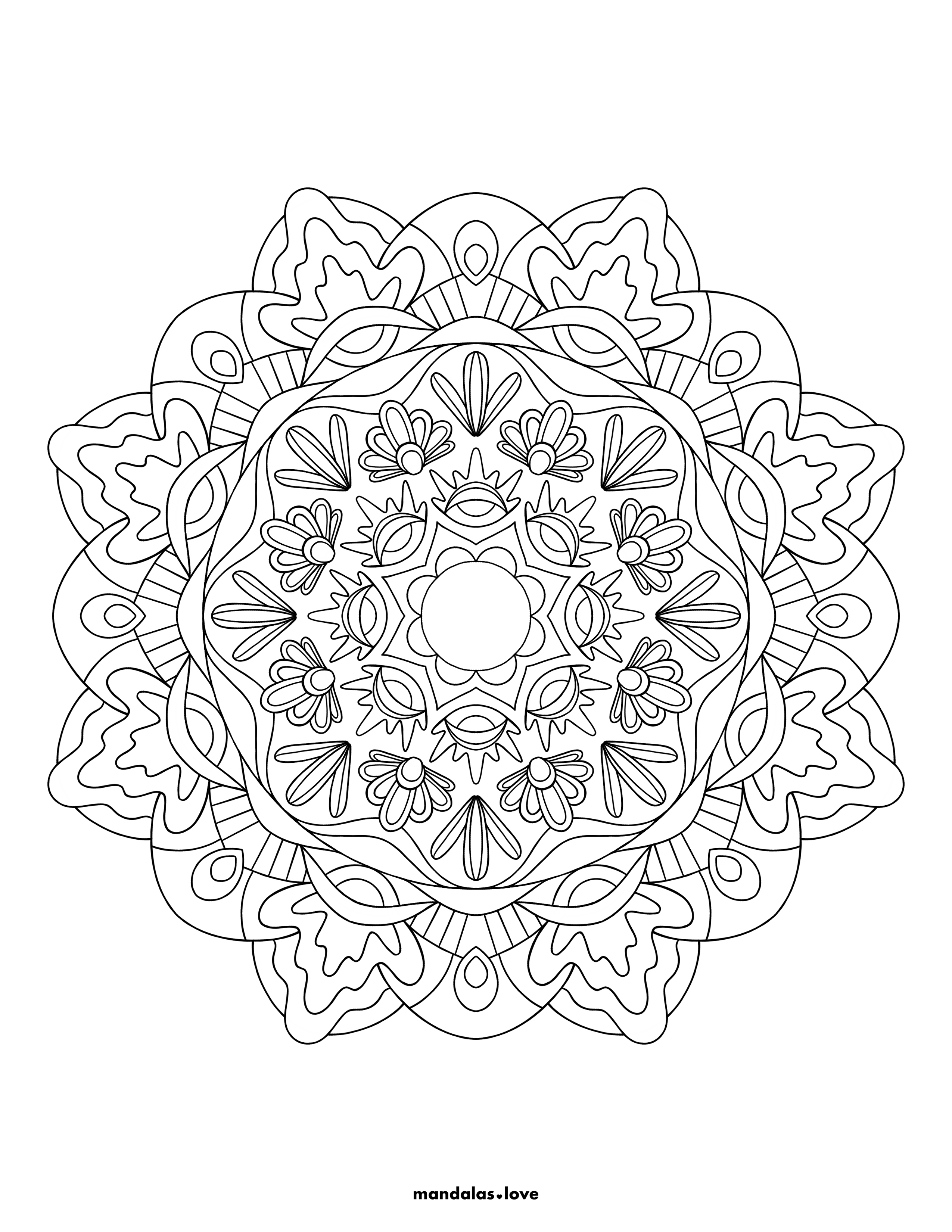 Romantic Garden Design with Central Bloom This charming mandala combines romantic heart shapes with delicate floral elements in a garden-inspired design. The central flower is surrounded by heart-shaped petals and flowing decorative elements that create a sense of love and natural beauty. The balanced composition and varied line weights offer opportunities for both bold and subtle coloring approaches. Ideal for those who appreciate romantic and botanical themes.
