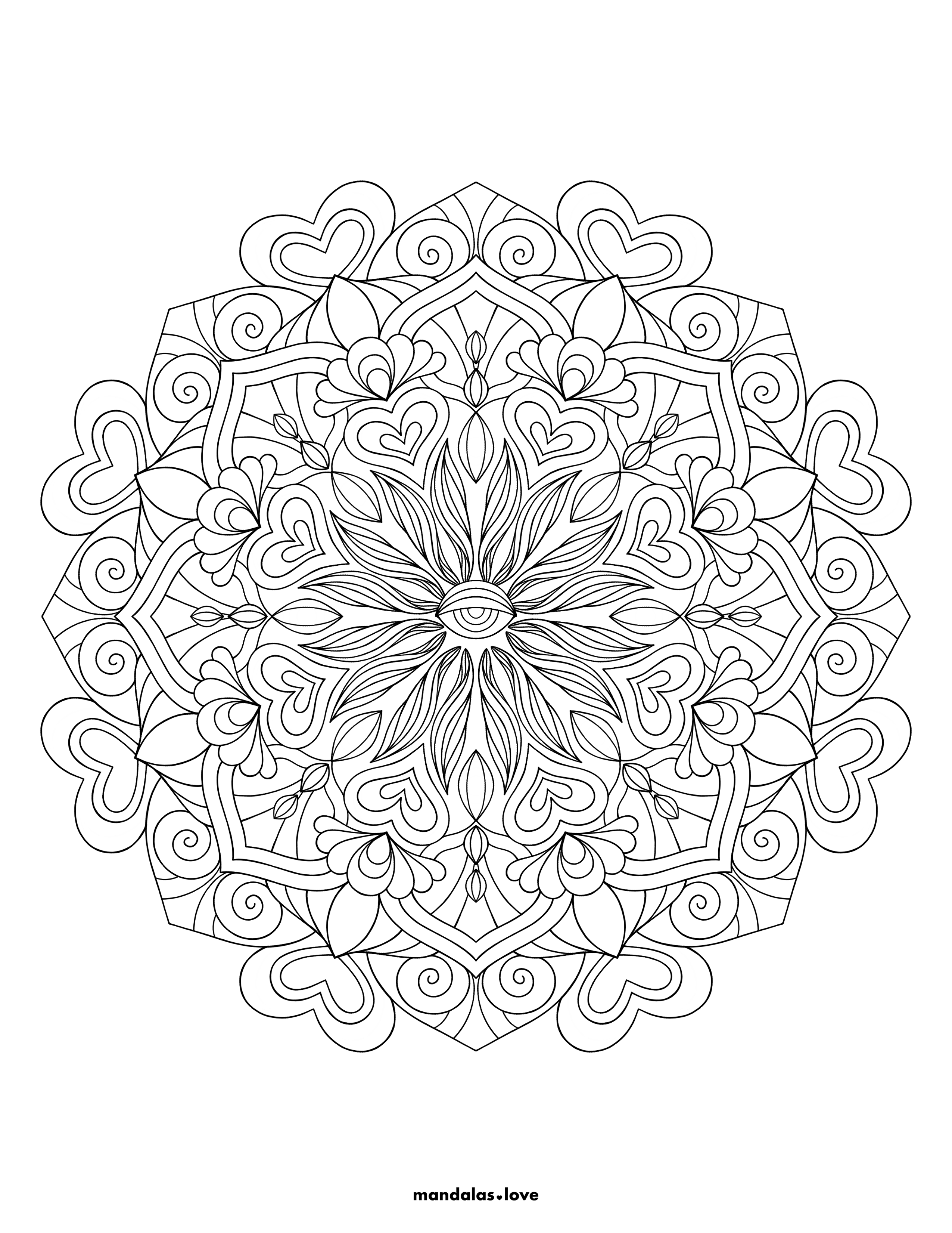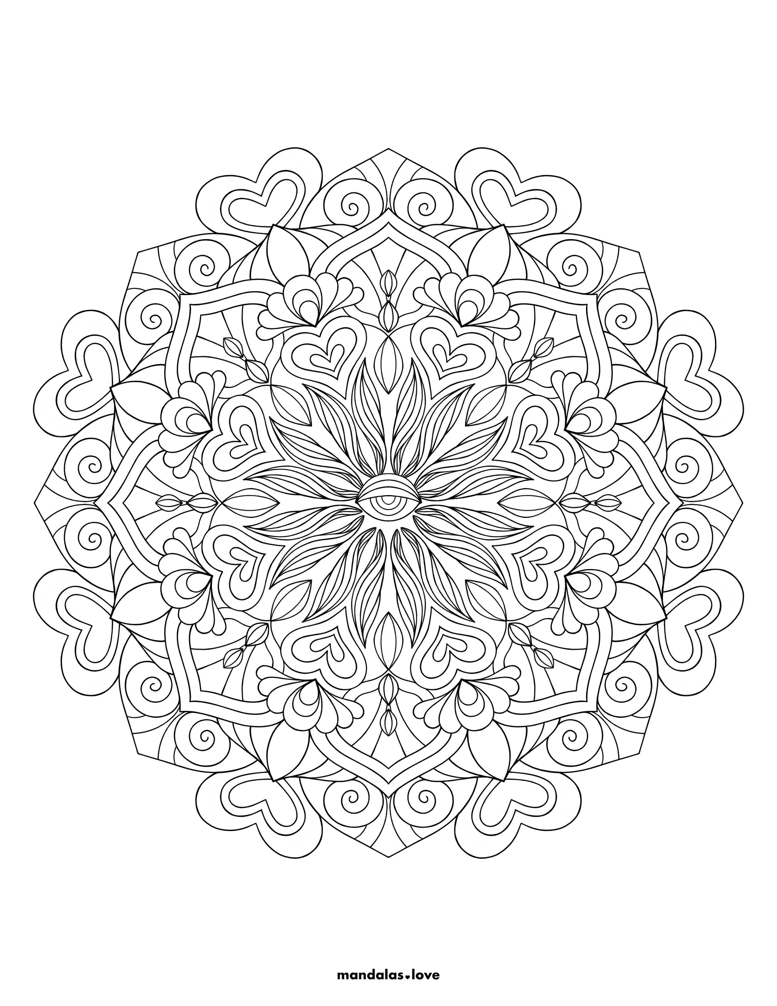 Romantic Design with Central Eye Motif This enchanting mandala combines symbols of love and wisdom through its heart-shaped petals and central eye design. The flowing curves and spiral elements create a sense of movement and energy, while the symmetrical pattern maintains perfect balance. The intricate details within each section offer numerous opportunities for creative color choices. This design is perfect for those who appreciate both romantic and mystical themes.