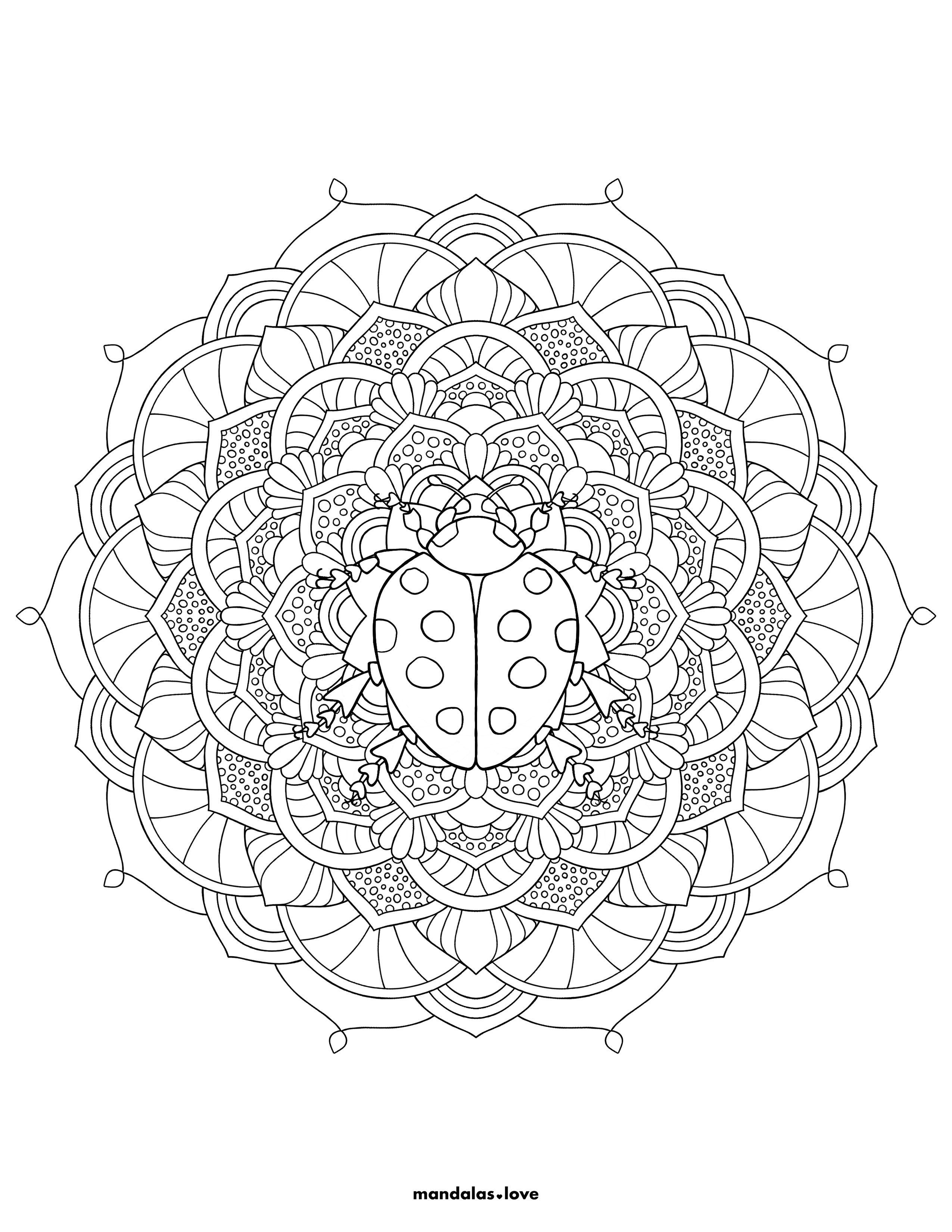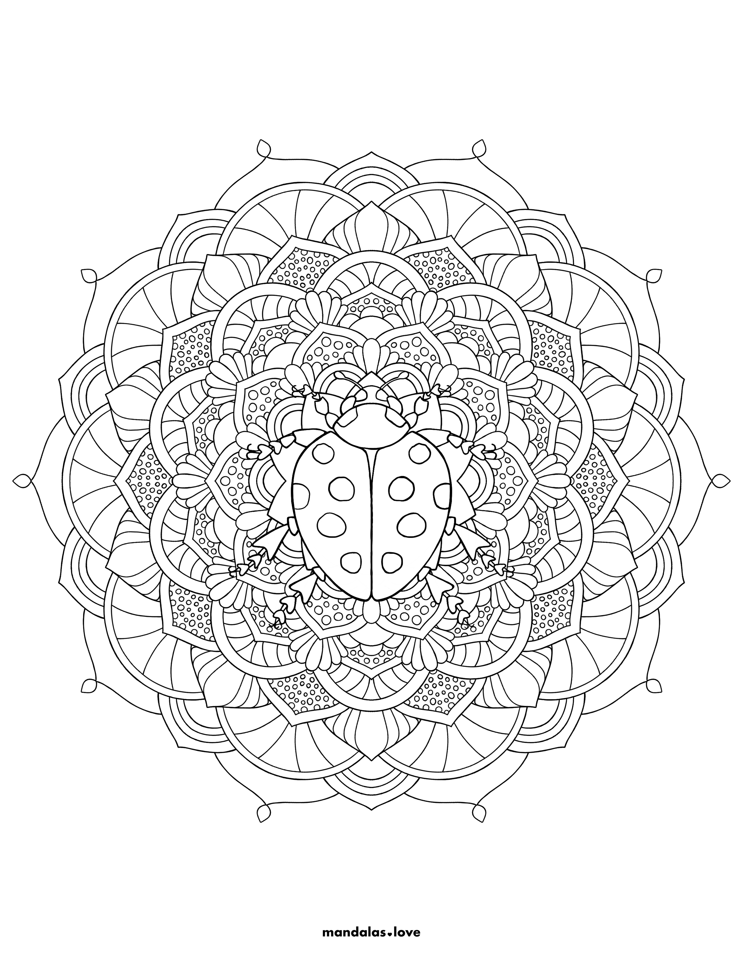 Whimsical Design with Central Ladybug Motif This delightful mandala features a charming ladybug at its center, surrounded by ornate floral patterns and decorative elements. The design combines nature's beauty with whimsical charm, creating a perfect balance of detailed botanical elements and playful insect imagery. The layered petal structure radiates outward, offering numerous sections for creative color combinations. This mandala is perfect for those who enjoy nature themes with a touch of whimsy.