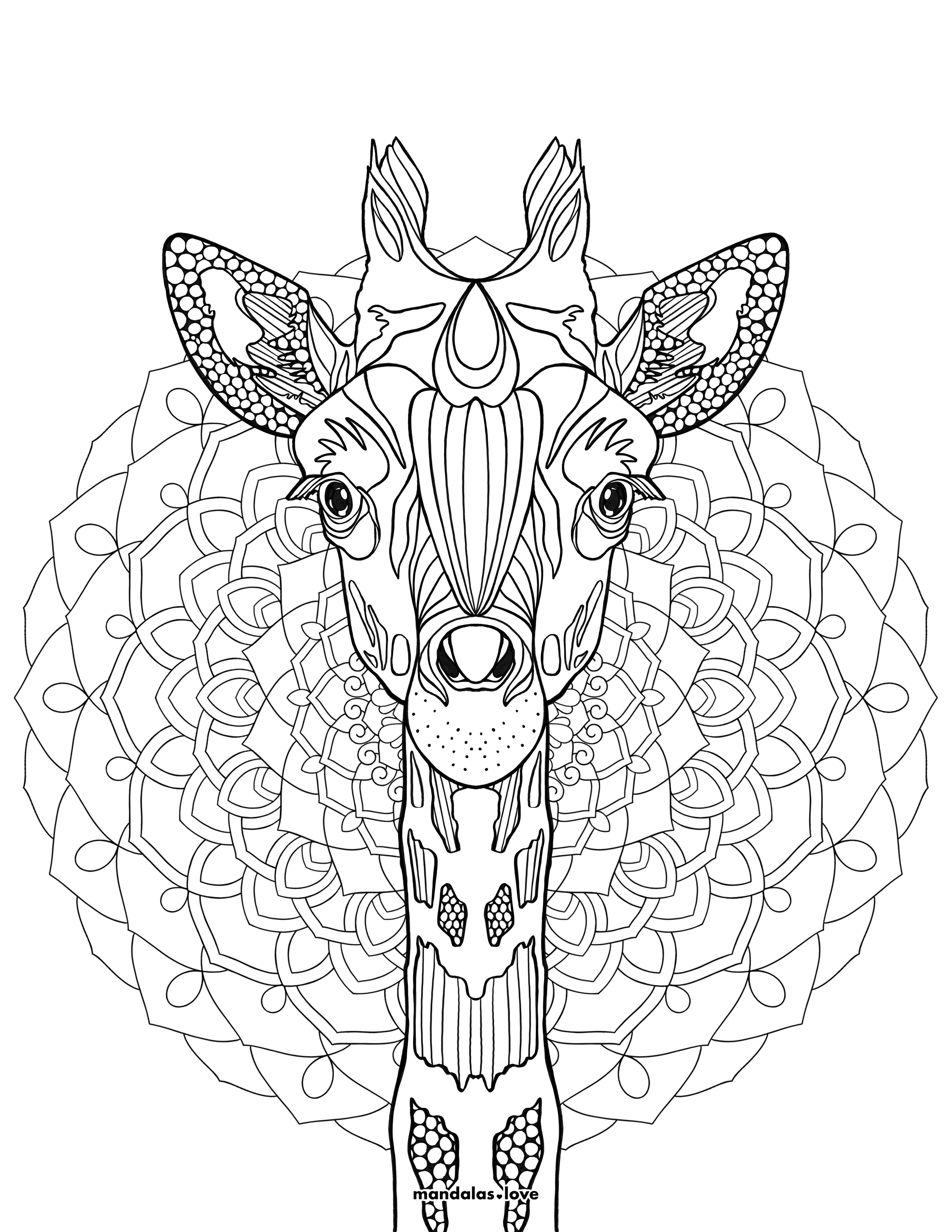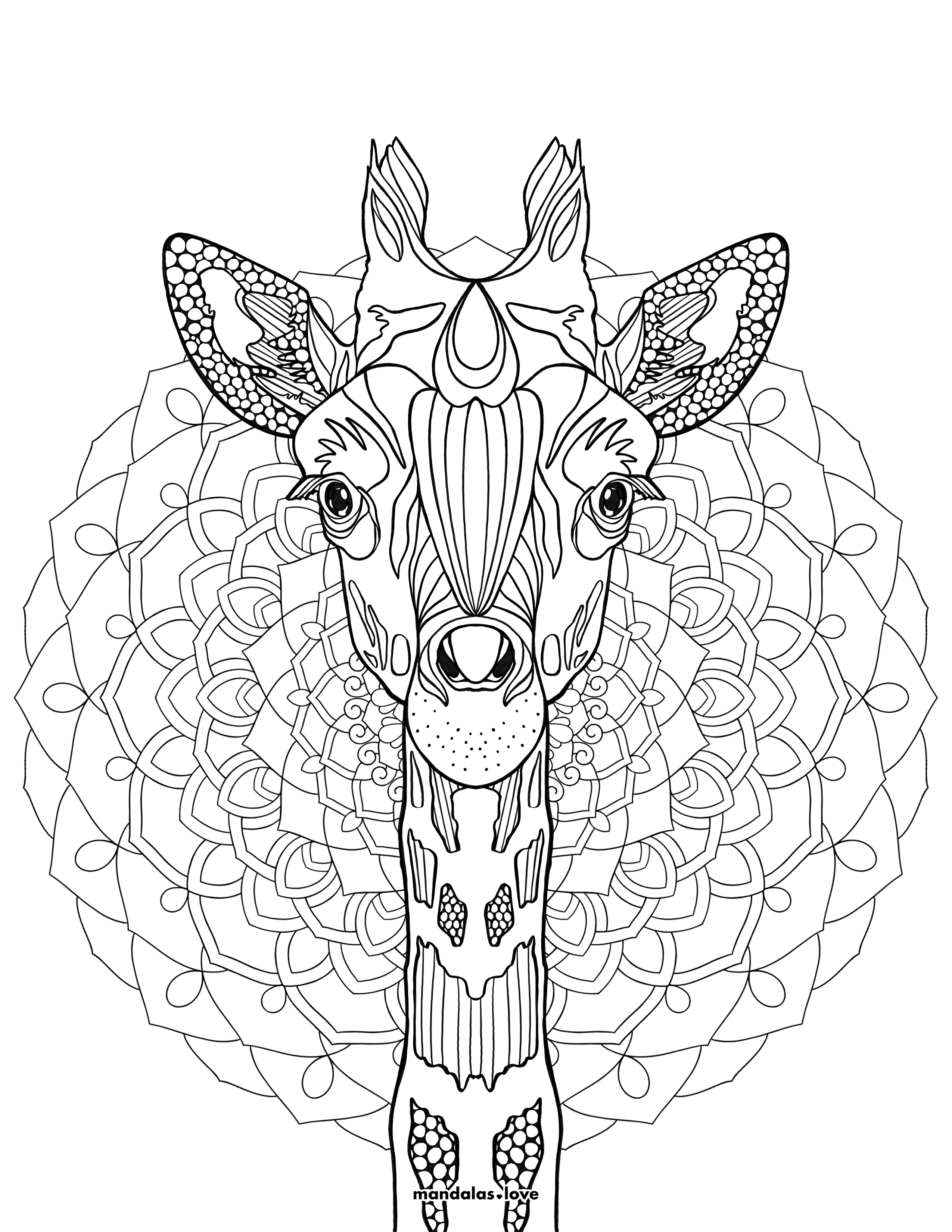 Discover the serene beauty of this magnificent giraffe mandala coloring page, where African wildlife meets intricate geometric artistry. This detailed design features a symmetrical giraffe portrait set against an elaborate circular mandala background. Elegant Wildlife Meets Sacred Geometry This captivating coloring page showcases a front-facing giraffe head adorned with zentangle patterns throughout its features, including detailed ears, expressive eyes, and characteristic ossicones. The surrounding mandala creates layers of flowing petals, loops, and geometric shapes that radiate outward in perfect symmetry. Every section offers unique pattern opportunities for creative color exploration and mindful relaxation. • Highly detailed giraffe portrait with zentangle embellishments • Multi-layered circular mandala background design • Perfect bilateral symmetry throughout the composition • Varied pattern densities for visual interest • Ideal for fine-tipped markers or colored pencils • Suitable for experienced colorists seeking a challenge