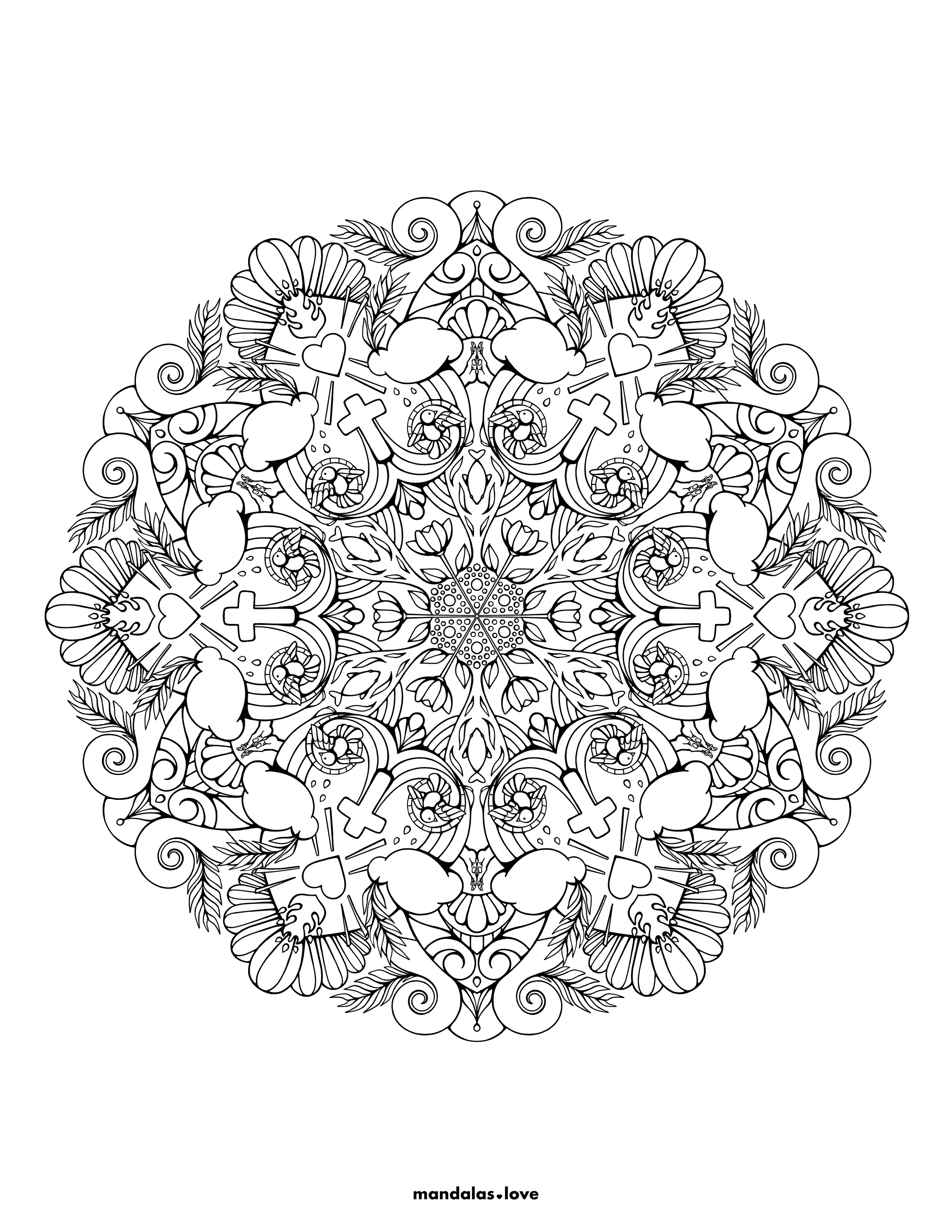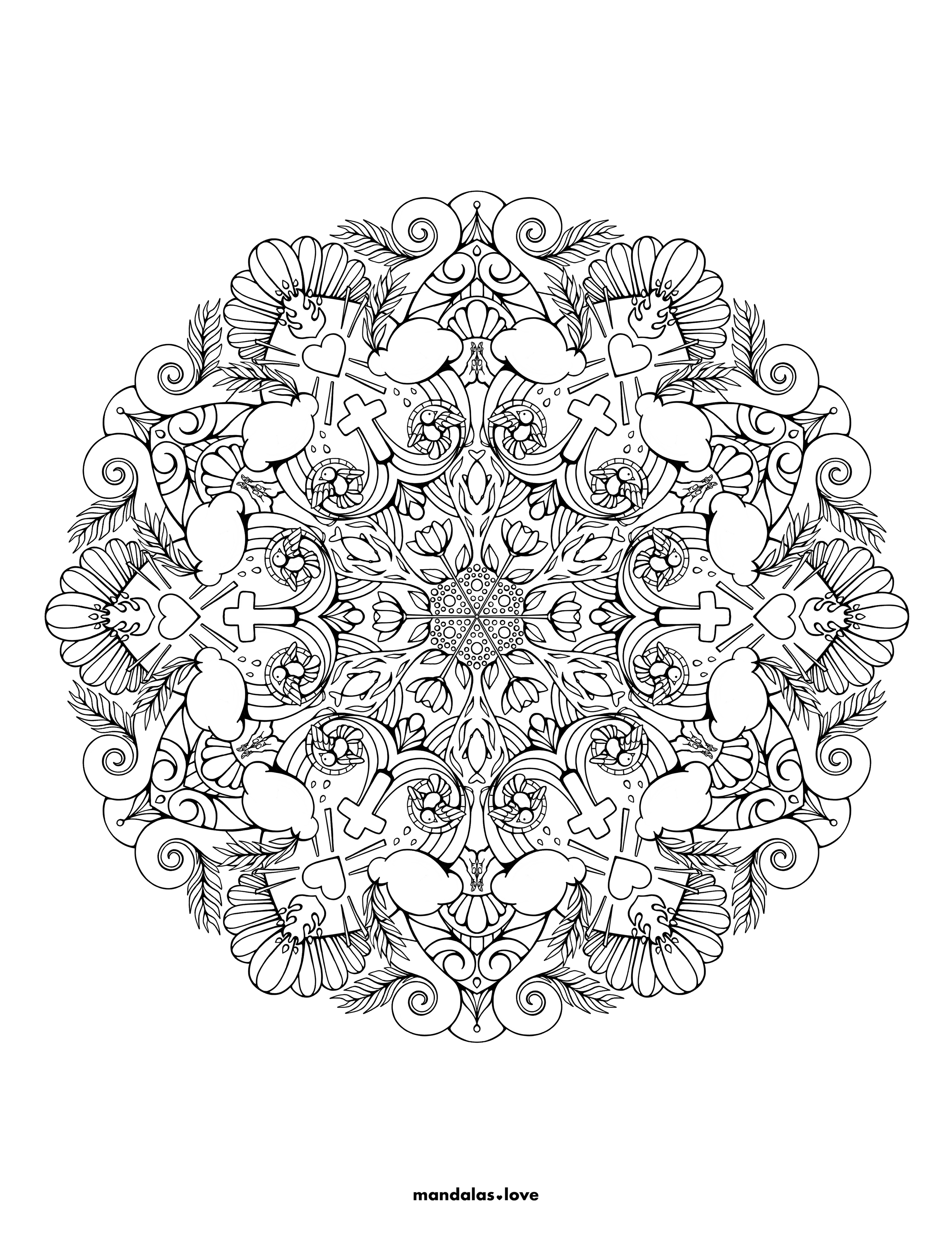 This beautifully intricate mandala features sacred hearts adorned with crosses, surrounded by elaborate swirls and delicate feathered elements. The symmetrical design radiates outward with perfect balance, creating a deeply spiritual coloring experience. SPIRITUAL SYMBOLISM MEETS ARTISTIC EXPRESSION This advanced mandala combines religious iconography with traditional mandala patterns for a truly meaningful coloring journey. The repeating sacred heart motifs are interwoven with ornate baroque-style flourishes, leafy branches, and decorative scrollwork. Each section offers detailed spaces to explore color combinations while finding inner peace and contemplation. - Intricate sacred heart symbols with cross details throughout - Elaborate baroque-inspired swirls and flourishes - Delicate feathered palm branches framing the design - Perfect radial symmetry for meditative focus - Multiple layered patterns for extended coloring sessions - Suitable for fine-tipped markers or colored pencils