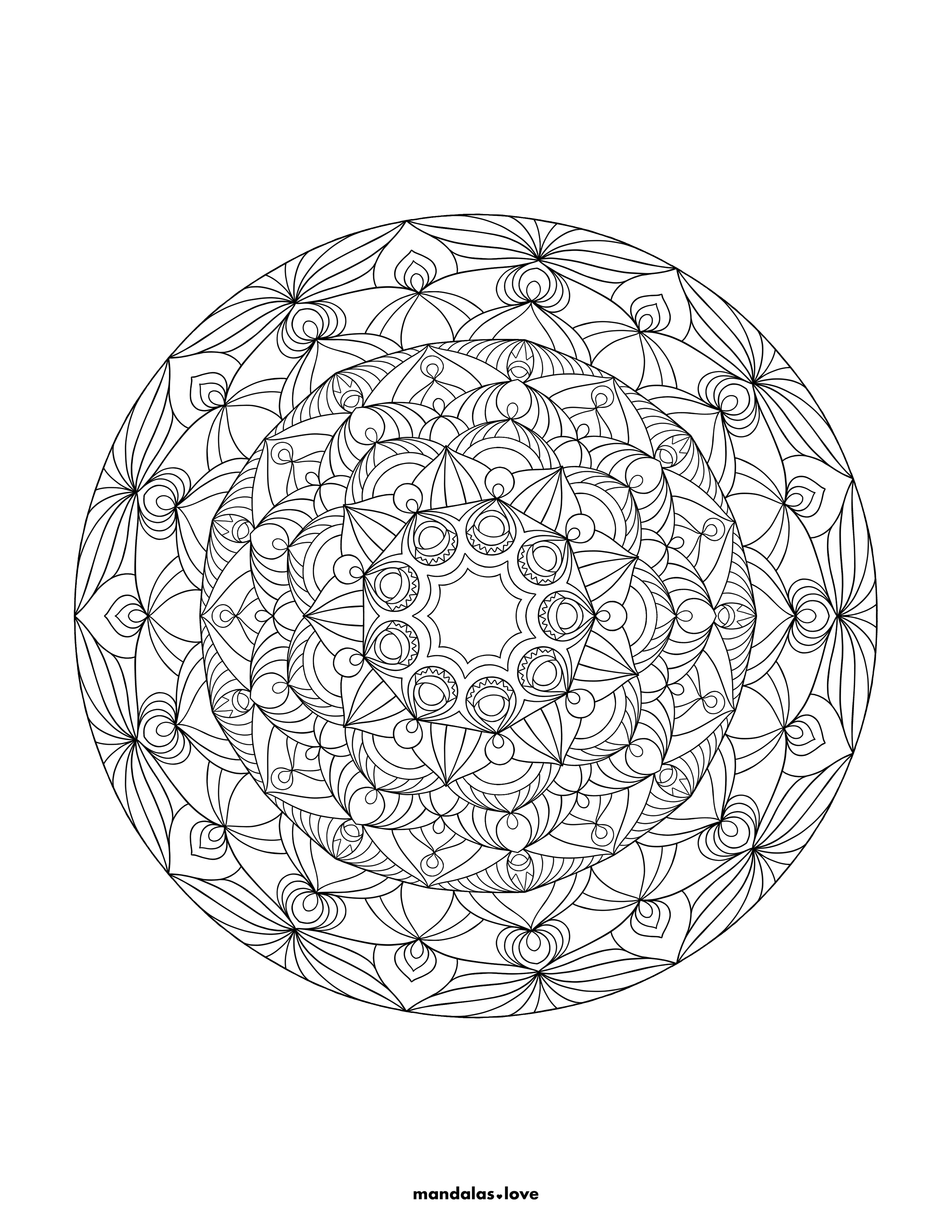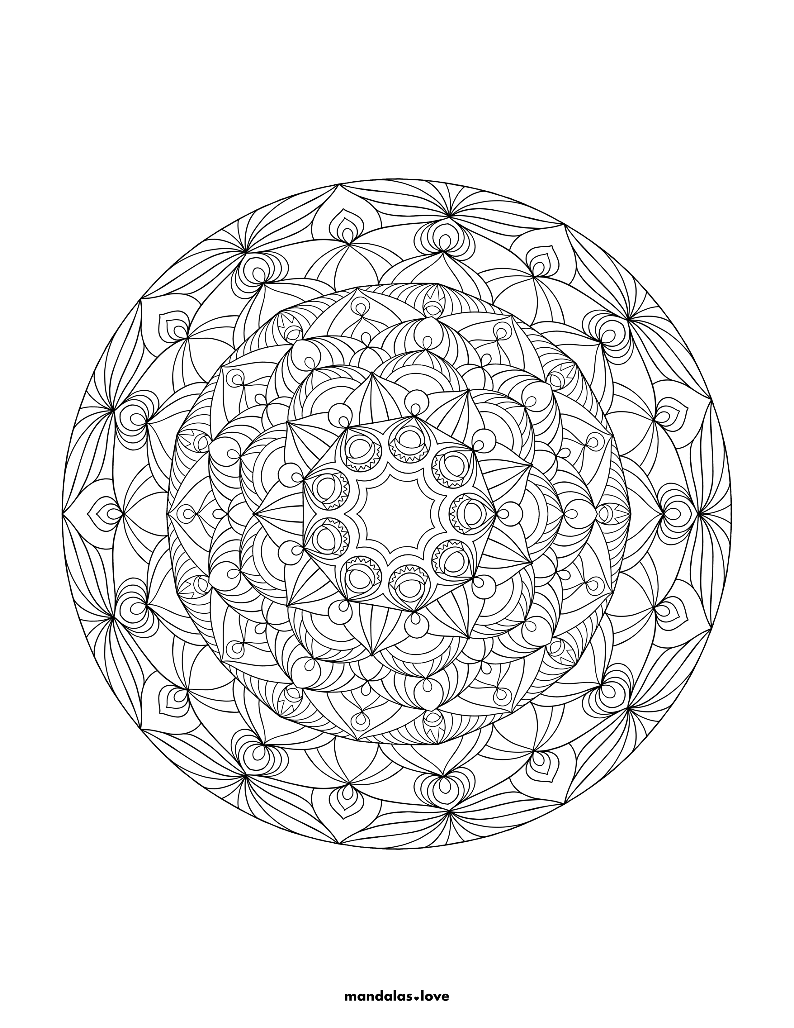 Immerse yourself in this beautifully crafted advanced mandala featuring elegant spiral patterns and layered petal designs. This intricate circular artwork offers hours of meditative coloring enjoyment for experienced colorists. Discover the Art of Mindful Coloring This sophisticated mandala showcases multiple concentric rings filled with delicate teardrop shapes, flowing curves, and symmetrical swirl patterns. Each layer builds upon the next, creating depth and visual harmony that draws the eye toward the ornate center. The balanced composition combines traditional mandala elements with flowing organic forms perfect for therapeutic relaxation. • Multiple intricate layers for extended coloring sessions • Symmetrical 8-point radial design • Delicate teardrop and swirl accent details • Perfect for stress relief and mindfulness practice • Suitable for colored pencils, markers, or gel pens • High-detail sections for advanced colorists